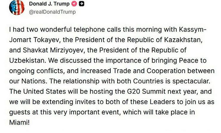 “This morning I had two wonderful phone calls with Kassym-Jomart Tokayev, President of the Republic of Kazakhstan, and Shavkat Mirziyoyev, President of the Republic of Uzbekistan. We discussed the importance of establishing peace in current conflicts, as well as expanding trade and cooperation between our countries. Relations with both countries are excellent. Next year, the United States will host the G20 Summit, and we will be sending invitations to both leaders to join us as guests at this very important event, which will take place in Miami!” Trump wrote.