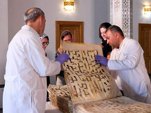 Restorers examine the Uthman Quran, 2024. Photo: Press Service of the Art and Culture Development Foundation of Uzbekistan