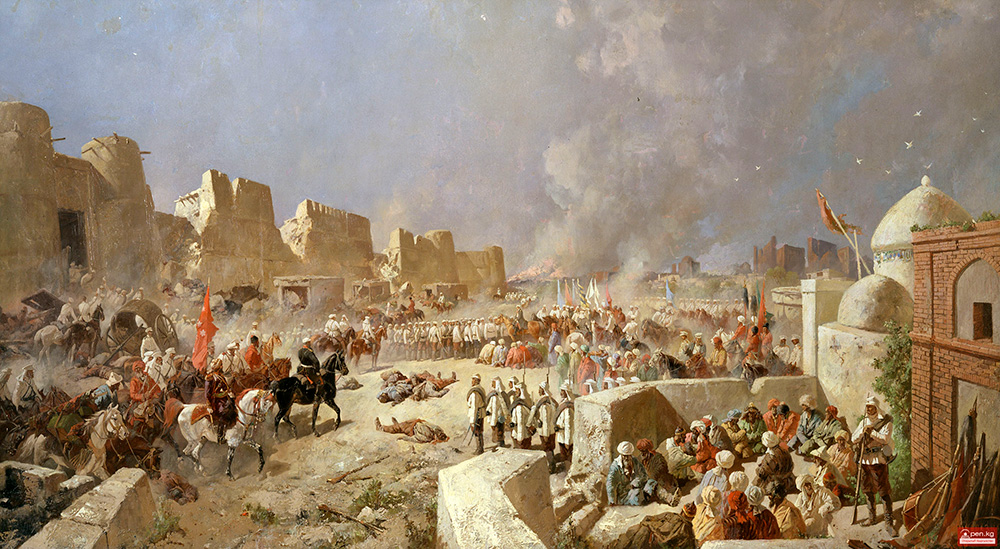 In May 1868, the city was captured by the Russian army under General Konstantin Kaufman. That same year, when Russian forces advanced to pursue the Emir of Bukhara, only a small Russian garrison was left in the Samarkand fortress. It numbered no more than seven hundred men, armed only with rifles, mortars, and two Russian cannons. There were 24 Bukhara cannons in the city, but they had been spiked and rendered unusable.