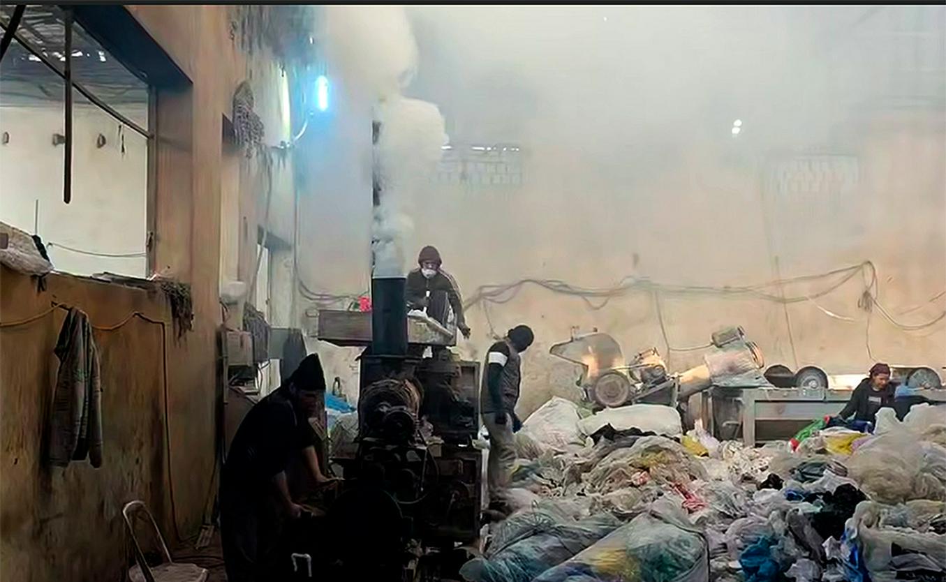 Still from a video showing illegal waste-burning at a plastics-processing facility in Zangiata District. Video published by the Eco Info Telegram channel.